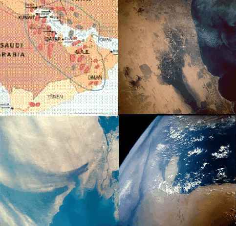 montage shows the location of the Kuwaiti oil fields (upper left) and shows