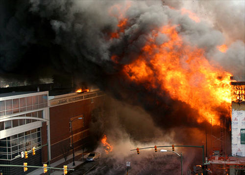 2006 Richmond. A construction worker dropped a cigarette into a trashbin which started a fire in the alley of a new retail/dorm building for Virginia Commonwealth University. It was a windy, dry day with the fire rapidly consuming the new building on Broad Street. Like a blowtorch or jet exhaust, the "wind-fed fireball" shot almost horizontally across Broad Street, an eight-lane primary roadway. The flames set the new VCU printmaking building on fire (picture on left). More omniously, embers flew blocks away dropping on buildings along the way. Homes and businesses went up in flames. Very quickly, the multi-alarm fire prompted a call for fire units from surrounding counties. Luckily, the hop-scotching fire did not cross the Interstate 95 despite embers making the trip. The smoke cause whiteout driving conditions like the dried-out swamp fires in Florida which has repeatedly closed I-95. |